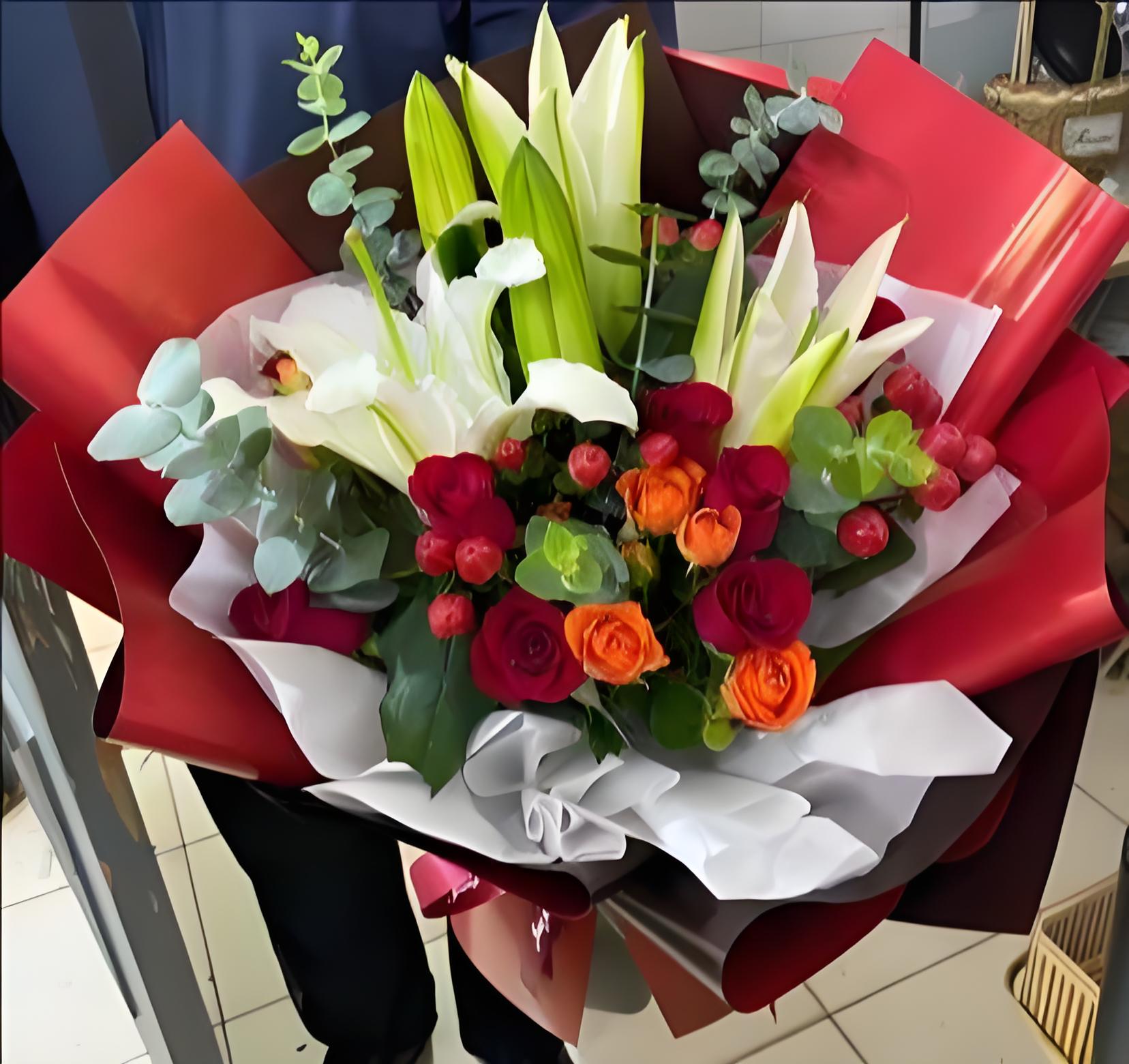 张家界永定区花店包11枝红玫瑰、2枝多头白百合、6枝橙色多头玫瑰、红豆、尤加利叶